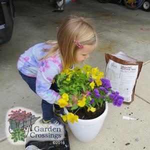 The phrase I hear a lot of lately from my toddler is, “Me help”. The task can be making a meal, bringing in the groceries, or planting up a new combination in a pot, and the list goes on. How can I resist the sweet little voice asking to help? Kids of all ages love to play in the dirt. So why not include them in your planting and let them experience the joy of planting a beautiful arrangement that they can take pride in.