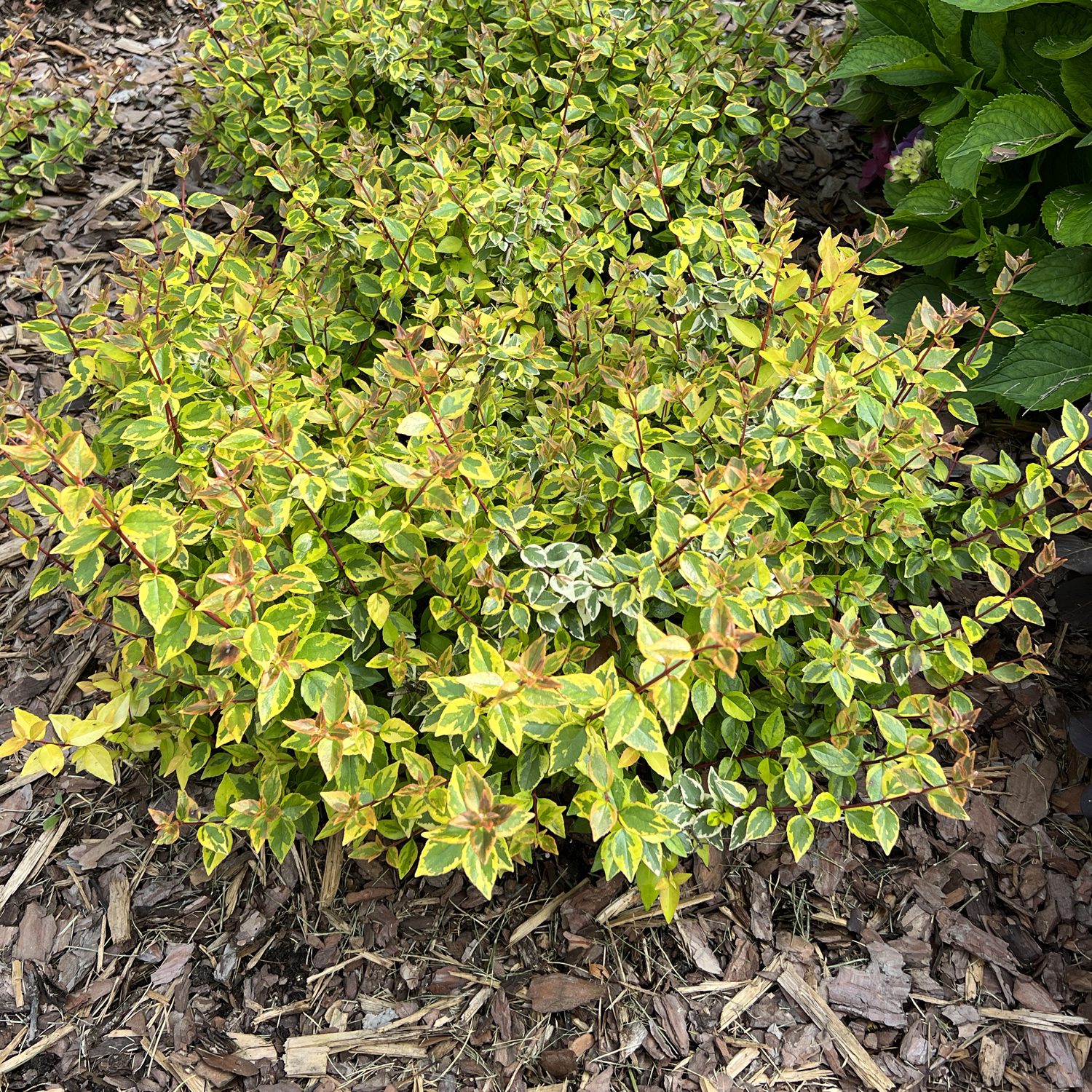 (Abelia) This Abelia gets an “A” for good behavior. The neat and dense growth of Abelia BRILLIANTINA™ is much less prone to exhibit long shoots that need to be trimmed throughout the season making it a great no-fuss addition to the landscape. Not only is BRILLIANTINA™ Abelia a well-behaved shrub, it displays beautiful variegated foliage of green and yellow with a splash of orange on the new growth that is contrasted by dark red stems. In early summer, this stunning foliage is joined by fragrant, white bell-shaped blooms that will attract pollinators to the garden. BRILLIANTINA™ Abelia is a semi-evergreen shrub for zones 6-9 and grows 3-4 feet high by 3-5 feet wide growing best in a full to part sun location with average moisture and well-drained soil. Once established, Abelia BRILLIANTINA™ can tolerate some dry soil conditions. This deer-resistant shrub is well suited as a specimen plant, in mixed borders, or as a low hedge. Any trimming should be done in early spring as the flowers are produced on new growth. Abelia BRILLIANTINA™ is a Proven Winners® ColorChoice® Flowering Shrub.