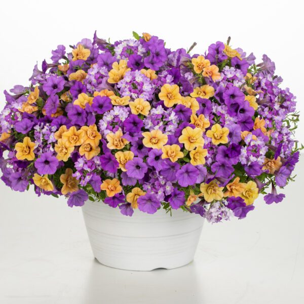 Let us help you with your garden Inspiration with our three in one plant combination! Enjoy the beautiful colors of Superbells® Double Amber, Supertunia Mini Vista® Indigo, and Superbena Sparkling® Amethyst planted in your landscape or in your container gardens. The ‘Polar Peach’ combination forms a mounded/trailing habit suitable for all your garden designs. This Proven Winners® annual combination grows best in full to part sun. We recommend fertilizing your combination once a week with a water-soluble fertilizer for best performance and plant health. Our expertly crafted selections take the guesswork out of beautiful plant combinations.
