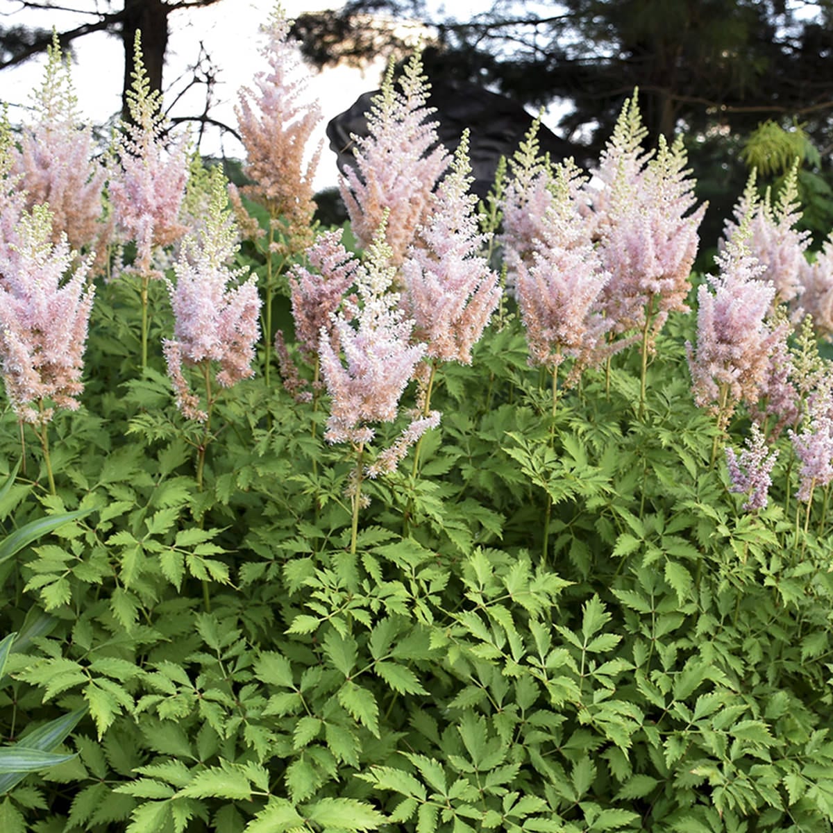 (False Spirea) Astilbe ‘Milk and Honey’, finally a white astilbe that holds up well under sun and drought! ‘Milk and Honey’ overflows with creamy white plumes that turn light pink as they age. The two color effect is lovely and very unique! This vigorous grower has bushy foliage that is somewhat marbled with green and silver when it is young. As the plant matures, the deeply incised foliage turns to glossy green. Are deer a problem in your garden? Astilbe ‘Milk and Honey’ is deer and rabbit resistant! The old foliage should be trimmed away in the spring before the plant wakes up again. This will help protect the roots from harsh winter weather. Astilbe is easy to grow and looks showy in mass plantings or borders.