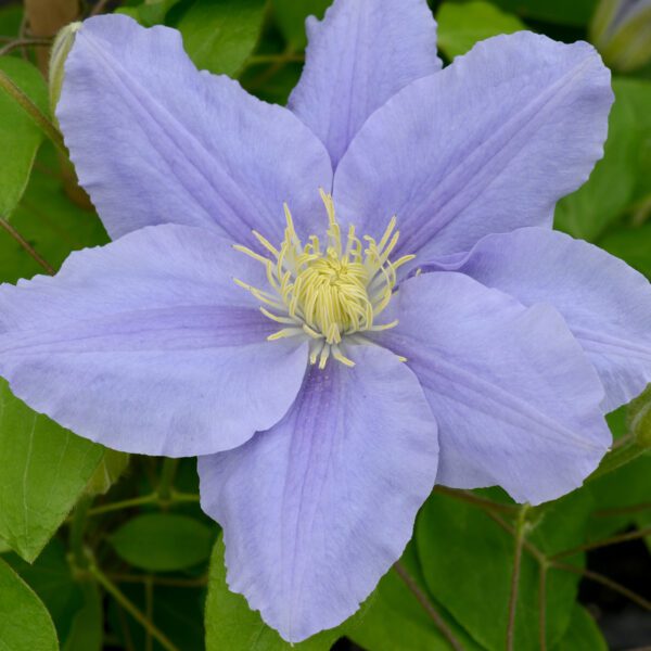 (Clematis) Ideal for container gardens, the Boulevard® series of Clematis is compact bloomers for small spaces. Boulevard® Zara™ Evipo062 features large 5 inch, ice blue flowers with overlapping petals. Standing 5 feet tall and spreading up to 2 feet wide. This free-flowering clematis blooms from early summer through the fall. Part shade is recommended for best coloration although it can be planted in a full sun location. Clematis like to be grown in moderate soil with good drainage. Shading of the roots is recommended and can be done by applying a layer of mulch or planting companion plants near the base. Hardy in zones 4-9, Boulevard® Zara ™ Clematis is a perfect addition to small gardens and patio planters to add some vertical color to the garden. Pruning is recommended in winter or early spring, trimming the vine back to 6 inches. Clematis color can vary based on bloom time, the amount of light they are receiving as well as humidity factors.