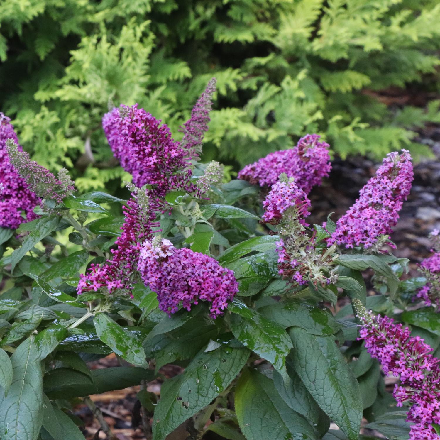 (Butterfly Bush) Pugster Pico Punch™ brings bold, tropical-inspired color to any sunny space, offering vibrant impact in a petite package. This compact shrub grows just 1½–2 feet tall and wide, yet its dense flower spikes deliver intense shades of red-pink and magenta from summer through fall. Each bloom cluster is packed with color, creating a brilliant show that stands out beautifully in borders, containers, and small garden spaces.