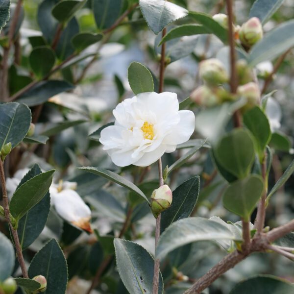 (Camellia) There is nothing more elegant than a white blooming Camellia and JUST CHILL™ Double White provides that with its double white flowers that are beautifully contrasted against the thick dark green foliage. This beauty would make the perfect addition to the moon garden, providing Fall to Winter blooming interest which is so hard to find. Standing 5-8 feet tall and spreading 3-5 feet wide the upright mounding habit of JUST CHILL™ Double White is perfect as a specimen, planted as a border or hedge. Hardy in zones 7(6b with protection)-9, Camellia does well grown in moist, well-drained acidic soil in full to part sun locations. Adding a layer of organic mulch is also recommended. If pruning is needed, we recommend trimming after it has bloomed in late winter or early spring. This deer-resistant shrub is evergreen in the southern zones. Camellia JUST CHILL™ Double White is a PROVEN WINNERS® COLORCHOICE® Flowering Shrub.