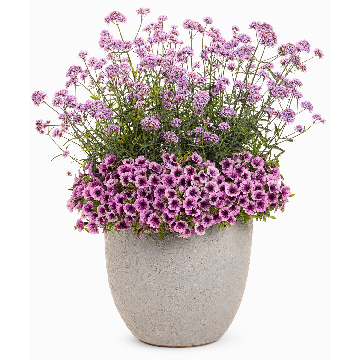 Two in One Plant Combination! Enjoy the beautiful colors of Supertunia® Bordeaux and Meteor Showers®. The beauty of annuals is their quick growth rate and longevity of blooms, color that lasts all summer. This collection includes 5 – 4.5″ potted plants, hanging basket or decorative container not included. For one collection we recommend a 12-14″ wide container with a depth of at least 8″. If you are looking to do a larger planter you may be interested in adding one or more of our ‘Thrillers’ to your design.