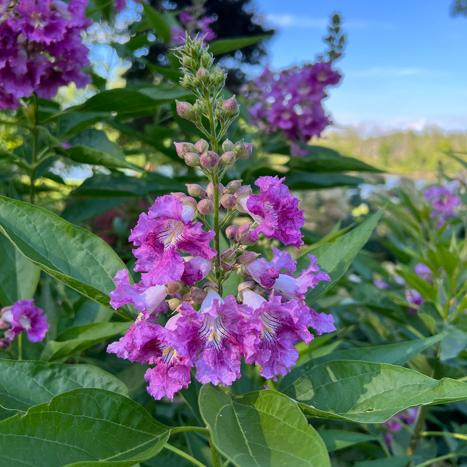 (Desert Orchid) Enjoy the large orchid-looking blooms of Chitalpa EL NIÑO®, Desert Orchid. Standing 10-15 feet tall and spreading to 8-10 feet wide, Chitalpa EL NIÑO® forms an upright mounded shrub. Mid Summer, beautiful lavender purple orchid-looking blooms emerge starting at the base of the flower cluster and continuing to open creating a full, long blooming flower. Hardy in zones 6-9, EL NIÑO® Desert Rose likes to be grown in full sun to part sun locations. In the cooler zones(6), you may find that this shrub dies back to the base. Trimming is rarely needed, but if desired we recommend trimming in the spring. This easy-to-grow North American native shrub, can tolerate poor soil conditions once established and is drought tolerant. The large fragrant flowers are a welcome addition to the landscape. This unique and compact form of Desert Orchid is deer resistant. Chitalpa EL NIÑO® is a PROVEN WINNERS® COLORCHOICE® Shrub.