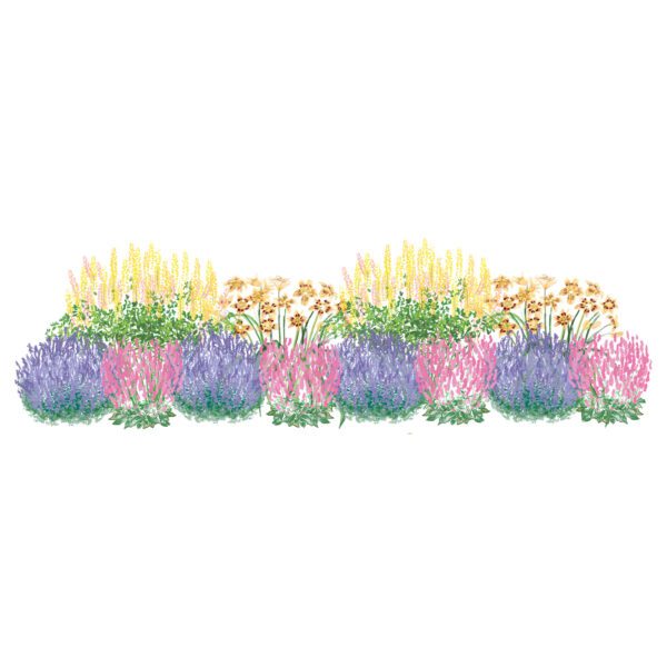 The EZ Scapes™ Dry Space Filler #3 Garden kit consists of: 2- DECADENCE DELUXE ‘Pink Truffles’ Baptisia, 2- RAINBOW RHYTHM ‘Sound of My Heart’ Daylily, 4- COLOR SPIRES ‘Back to the Fuchsia’ Salvia, and 4- Nepeta ‘Cat’s Pajamas’. This collection is recommended for a 7’x12′ garden.