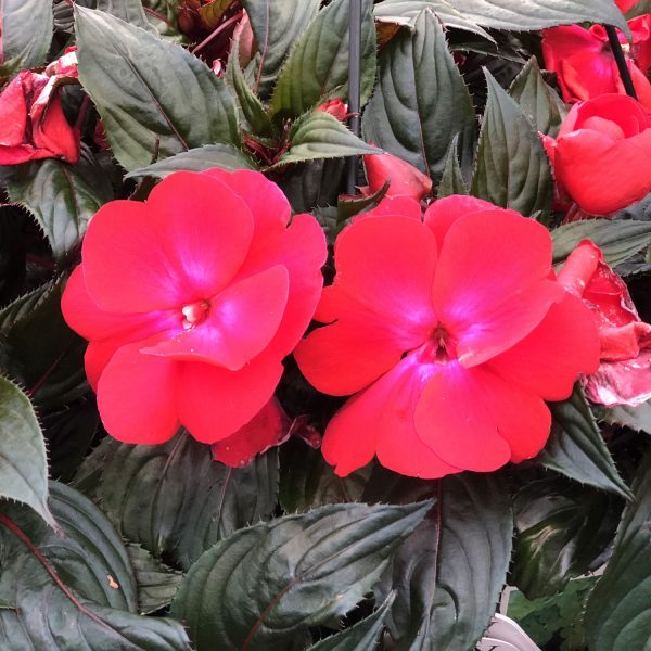 (New Guinea Impatiens) INFINITY® Cherry Red Impatiens have large, cherry-red flowers with a shiny iridescent glow that contrasts beautifully with the bright green foliage. INFINITY® are a vigorous growing New Guinea Impatiens bred and selected for superior landscape performance. New Guineas are a great choice for shady locations. They add a nice splash of continuous color. Their extra large flowers are perfect for large baskets and patio containers. INFINITY® Cherry Red is also great thriller for your landscape. Be sure to keep your plants well watered. If they do dry out, be sure to water them right away as they should bounce back. New Guinea Impatiens are an easy to care for variety.