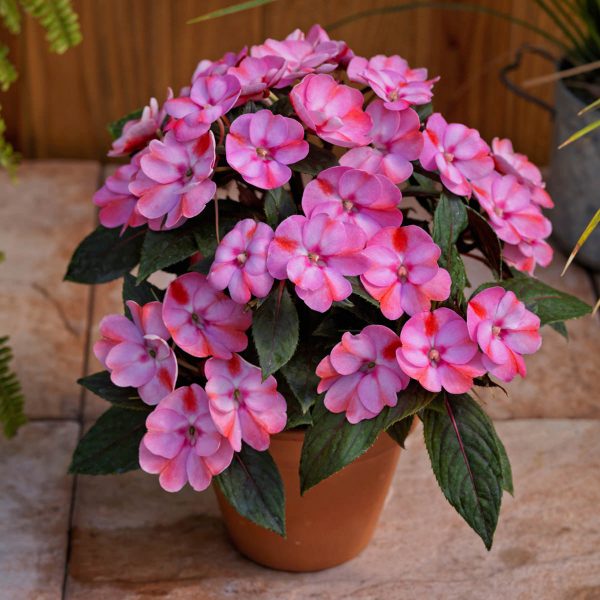 (Impatiens New Guinea-Sun) You can now enjoy the look of shade-loving New Guinea Impatiens in the sun with SunPatiens® Compact Pink Candy. The bold, bi-colored pink blooms of SunPatiens® Compact Pink Candy can grow in full sun to part shade locations and add color to your garden from spring through the first frost. SunPatiens® are known for their sun-loving and heat-loving qualities and are not affected by downy mildew. The thick, dark green leaves are the answer to why these typical shade plants can tolerate the sun and humid conditions. Like any New Guinea Impatiens, SunPatiens® Compact Pink Candy prefers a moist location and to be kept well watered. Standing 16-30 inches tall and spreading up to 20 inches across SunPatiens® Compact Pink Candy makes a great thriller in your landscapes, it is low maintenance, self cleaning and can handle the warm summer sun.