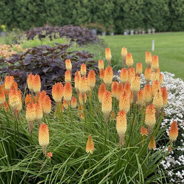 (Red Hot Poker) Add a look of the tropics to your garden with Kniphofia PYROMANIA™ ‘Hot and Cold’! Red Hot Poker PYROMANIA™ ‘Hot and Cold’ stands 32-36 inches tall and spreads up to 28 inches wide. This reblooming perennial will add color and texture to your garden all season long. Starting in early summer and reblooming through the end of summer, PYROMANIA™ ‘Hot and Cold’ features tangerine orange buds that open and fade to a creamy white flower. The bi colored blooms create upright spikes that add vertical interest to the garden. The bright green, upright grass like foliage adds additional interest. Hardy in zones 5b(protected) to zone 9, Kniphofia PYROMANIA™ ‘Hot and Cold’ likes to be grown in a full sun location and is drought tolerant once established. The butterfly, bee and hummingbird friendly blooms are deer and rabbit resistant! Perfect for borders, or as a specimen, it is a long blooming perennial with plenty to spare if you should decide to cut a few blooms for indoor enjoyment. Kniphofia PYROMANIA™ ‘Hot and Cold’ is a PROVEN WINNERS® Perennial.