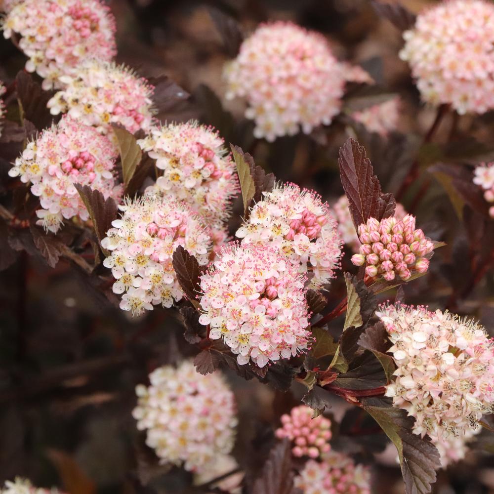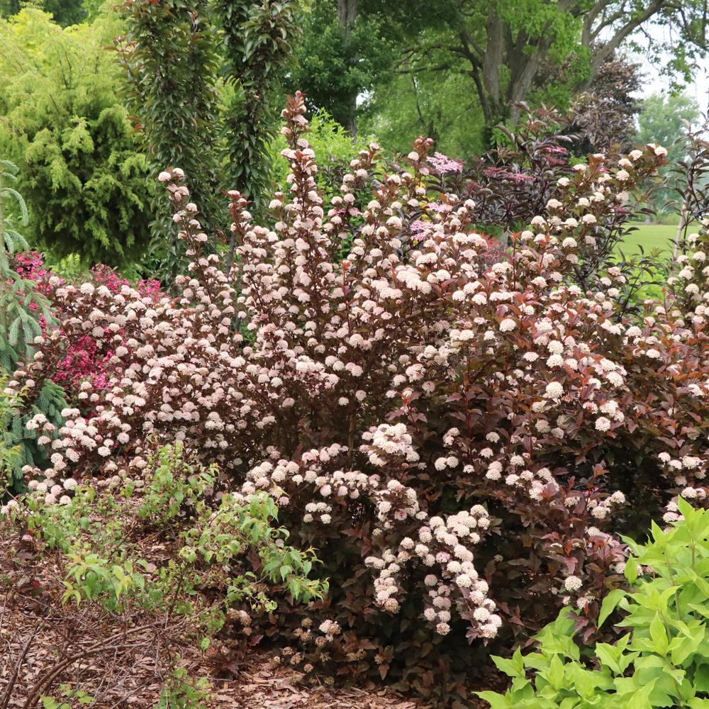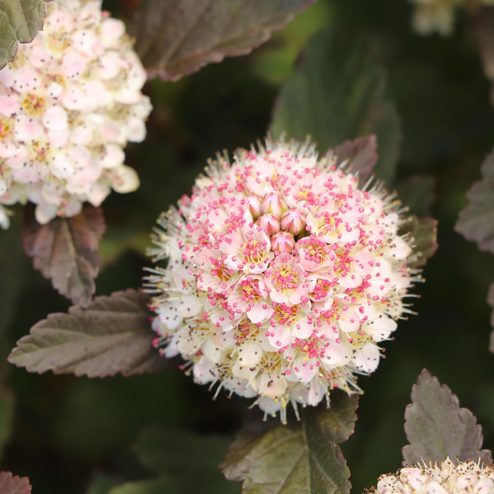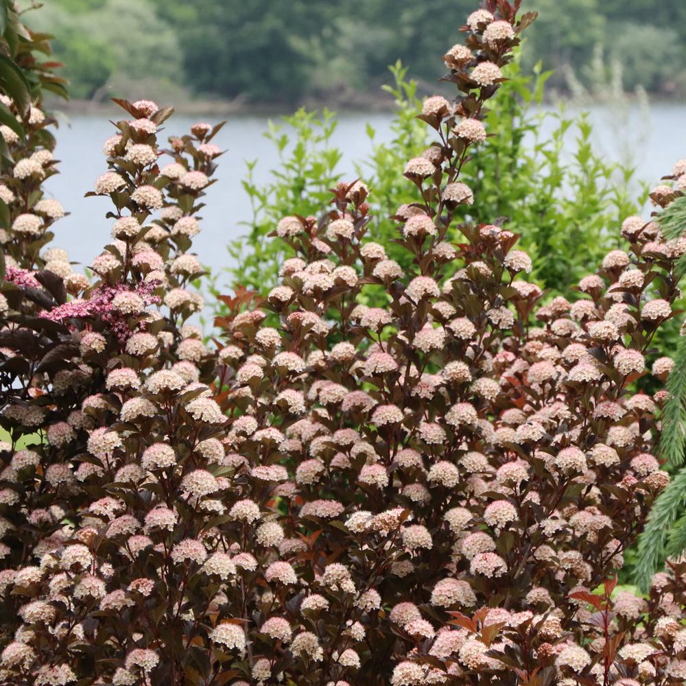 (Ninebark) Rich color, graceful texture, and year-round appeal come together beautifully in Physocarpus Summer Wine® Rose Ninebark. This hardy deciduous shrub stands out with its rosy-pink new growth that deepens into a warm, burgundy-purple foliage as the season progresses. The arching branches in late spring to early summer, is topped with clusters of soft pinkish-white flowers, creating a stunning contrast against the dark leaves. As the blooms fade, decorative seed capsules add subtle texture and interest for months to come. This new specimen has increased powdery mildew resistance.